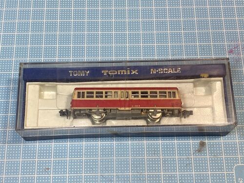 ↑今回のお題はこちら。1977年に発売されたTOMIXのふるーい香港製キハ02です。私よりちょっとだけお兄ちゃんですね。ヤフオクで「ジャンク品まとめ」の中に混じっているのを発見し、ほかにも興味をひく車両があったので落札しました。一点あたりで割ると300円…